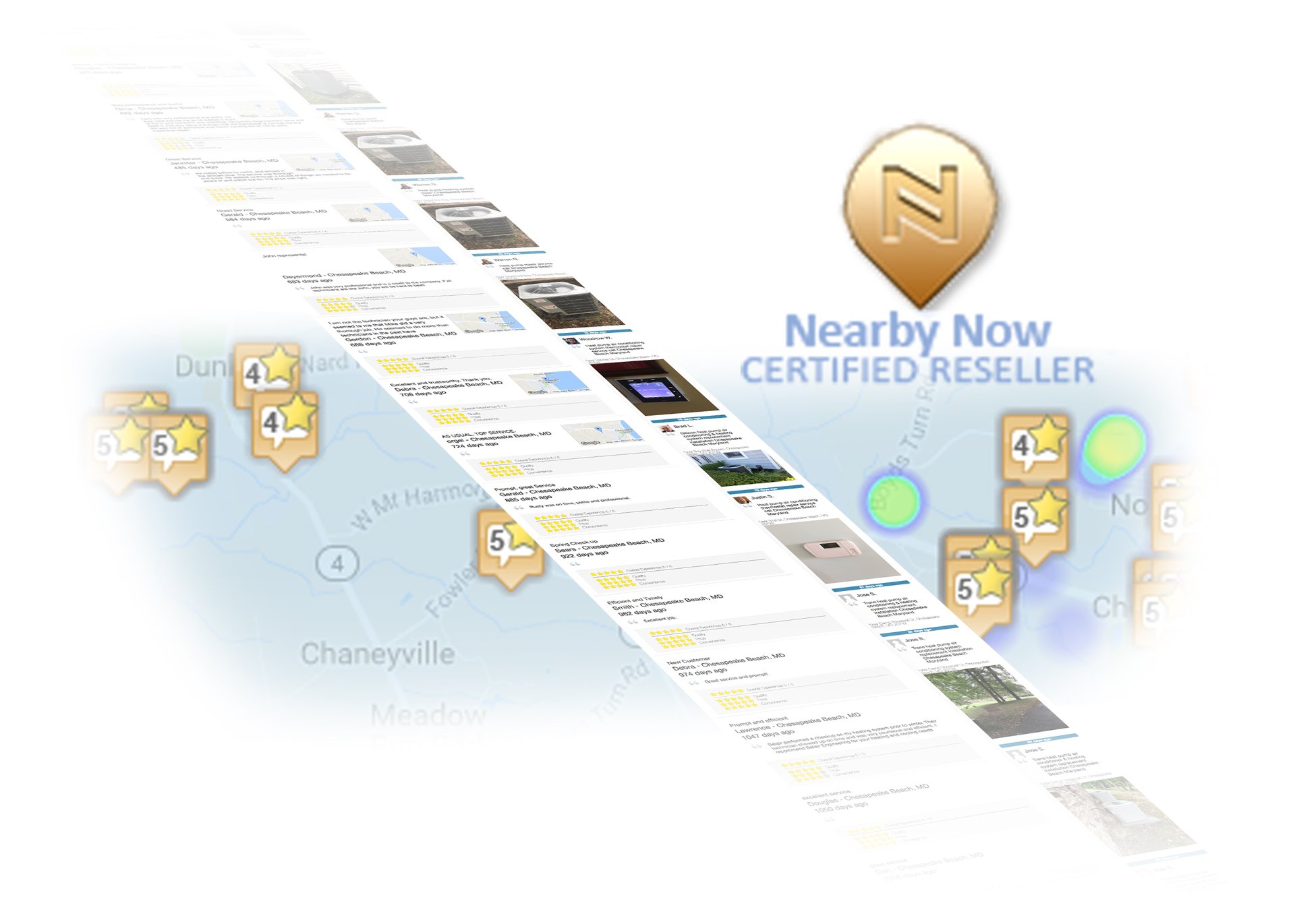 We offer fully-managed Nearby Now, a live interactive review system that is implemented directly into your website and that updates in real-time when your technicians check-in at each job from their phones and receive reviews from your clients. Better yet, it helps your SEO visibility in every city you serve.