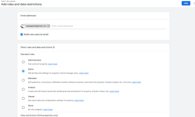 Enter oapagepilot@gmail.com or whichever google account you want to add in the "email address" field like shown above.